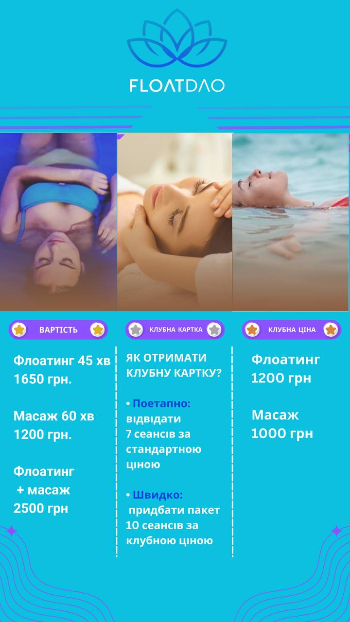 и подарочный сертификат вместо 650 грн., 450 грн. - клубная цена, 400 грн.- цена для именинников, 800 - массаж + флоатинг.
